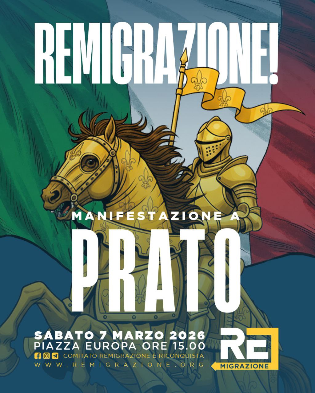 Prato, 5 marzo – Il comitato Remigrazione e Riconquista conferma ufficialmente luogo e orario della manifestazione in programma sabato 7 marzo a Prato. Il ritrovo è previsto in Piazza Europa alle ore 15.