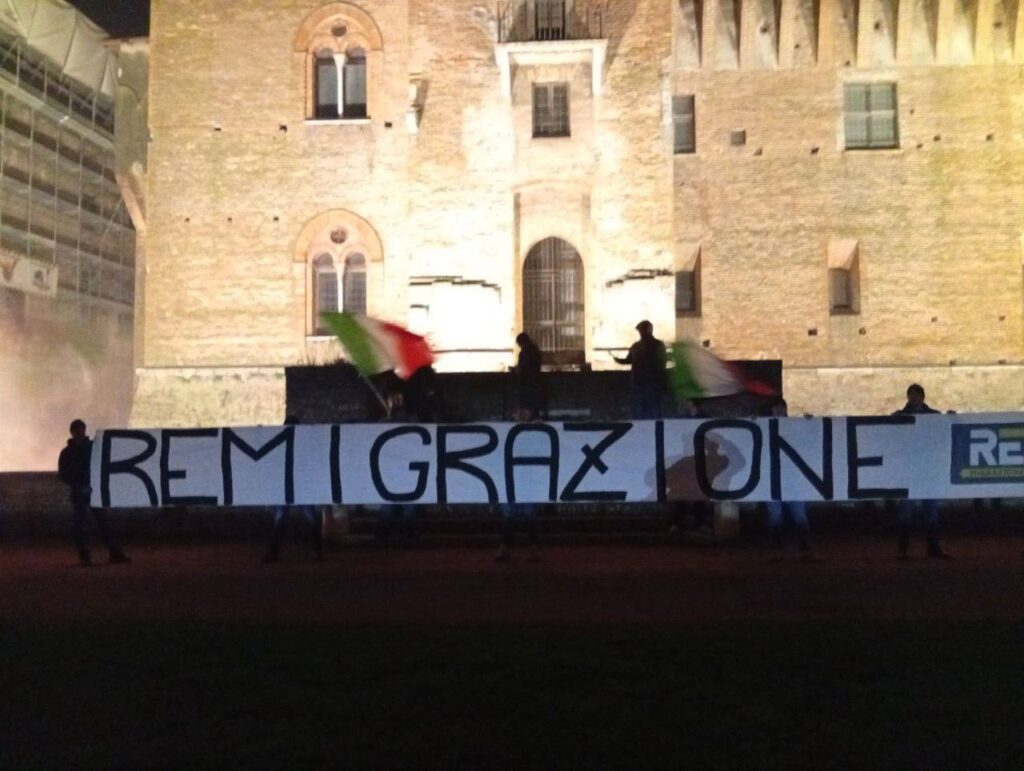 Di fronte al Castello di San Giorgio è stato srotolato uno striscione lungo 14 metri con espressa una parola che gli onesti mantovani ormai chiedono da tempo: REMIGRAZIONE.