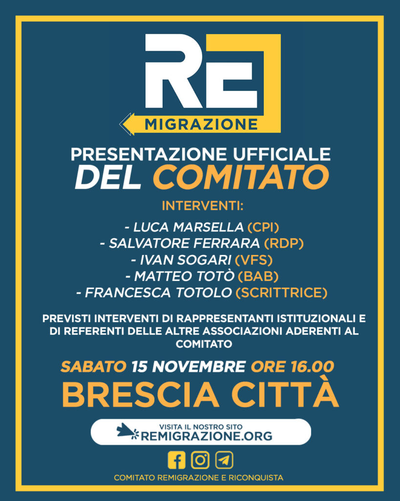 Brescia si prepara ad accogliere, sabato 15 novembre alle ore 16, la prima presentazione ufficiale del Comitato Remigrazione e Riconquista, realtà nata dall’unione di vari movimenti identitari decisi ad avviare la raccolta firme per una legge di iniziativa popolare sulla remigrazione.