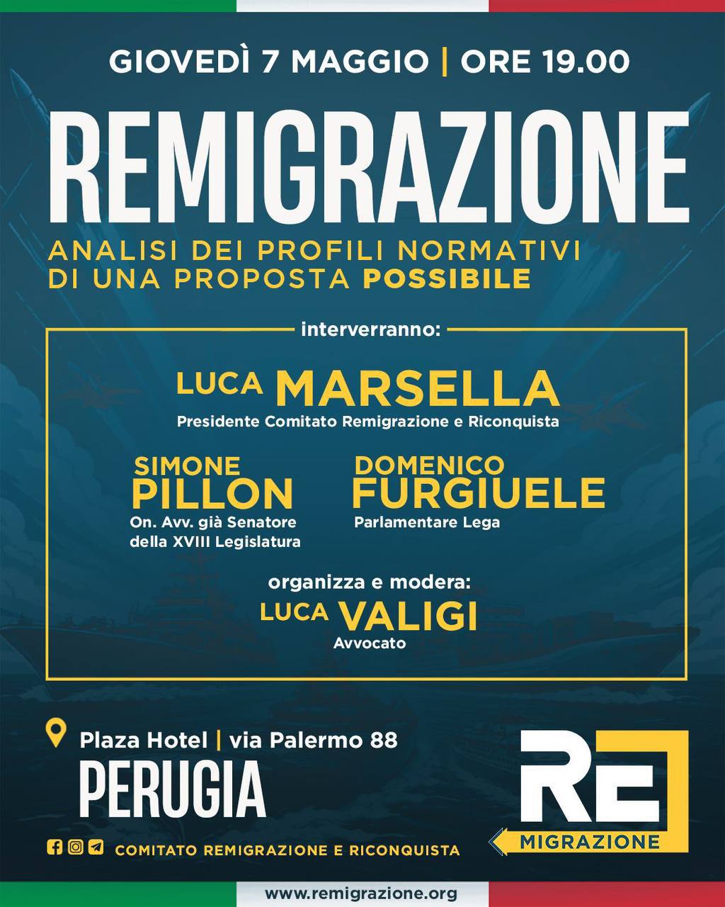 Perugia, 30 aprile – Si terrà giovedì 7 maggio alle ore 19 al Plaza Hotel in via Palermo 88 la presentazione della proposta di legge sulla remigrazione, che arriva anche a Perugia.