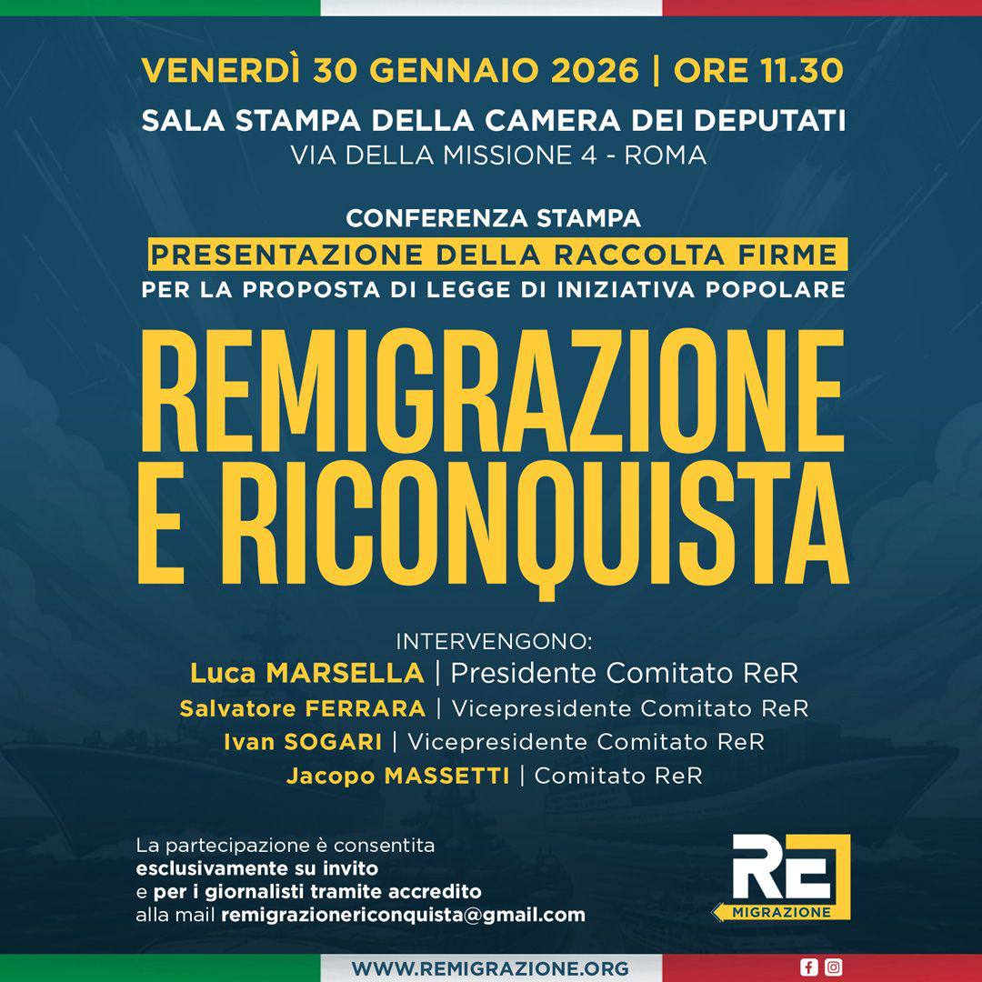 Venerdì 30 gennaio alle ore 11.30 si terrà presso la sala stampa della Camera dei Deputati in Via della Missione 4 a Roma, la conferenza stampa di presentazione dell’avvio della raccolta firme a sostegno della proposta di legge di iniziativa popolare Remigrazione e Riconquista.
